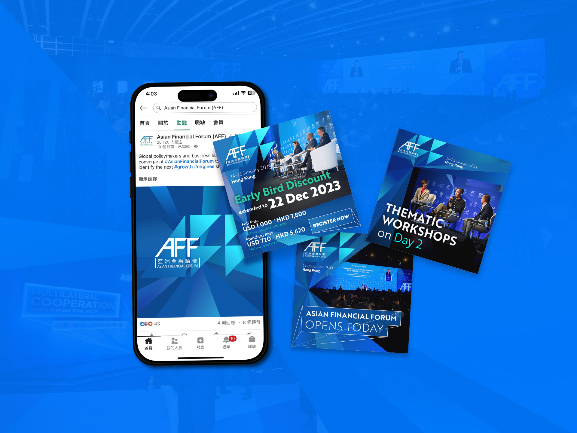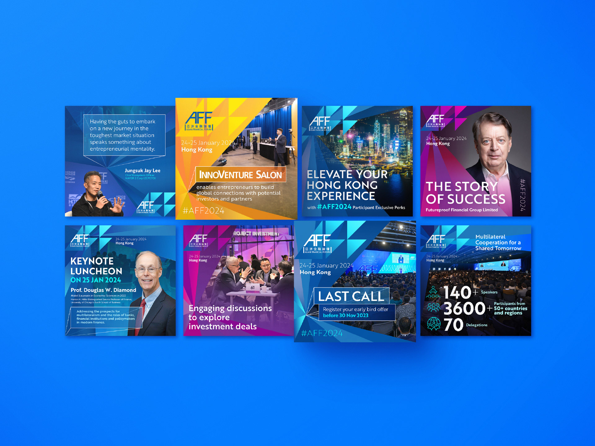 For the Asia Finance Forum 2024, I developed a unified social media visual strategy across LinkedIn, Google Ads, and Facebook, supporting the event’s positioning as a flagship regional finance platform. My approach centered on clarity, consistency, and adaptability, using a modular system of layouts and brand-driven color palettes to maximize recognition and engagement. Messaging hierarchy was optimized to highlight event value propositions, drive registrations, and encourage post-event sharing. Collaboration with client stakeholders ensured all creative met brand guidelines and digital best practices, resulting in a campaign that delivered strong, targeted visibility in both local and international markets.