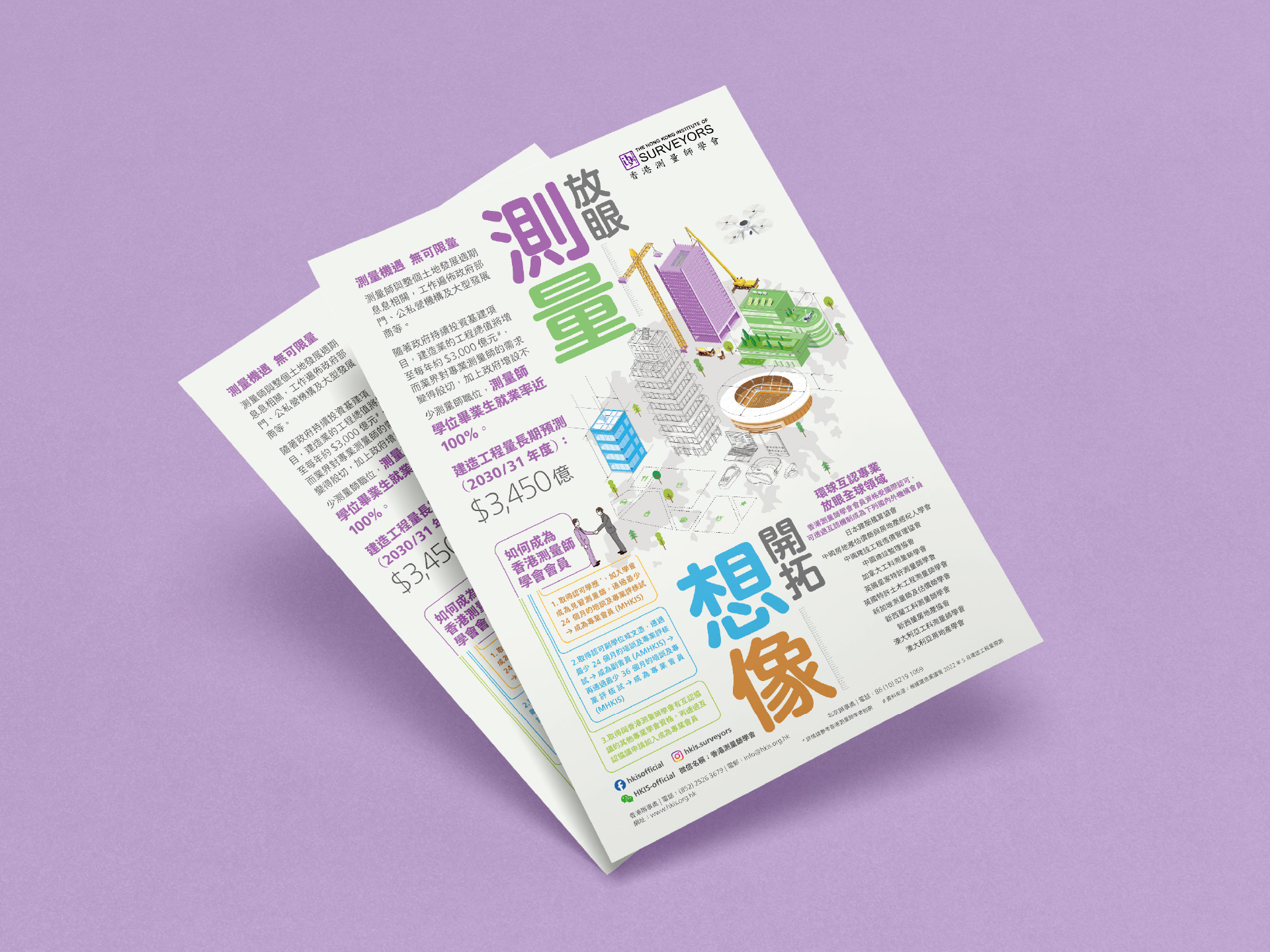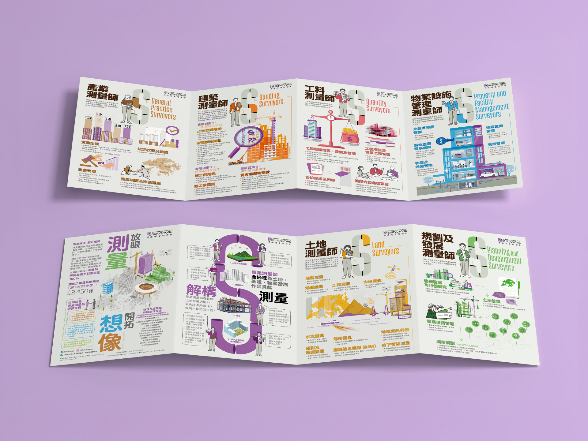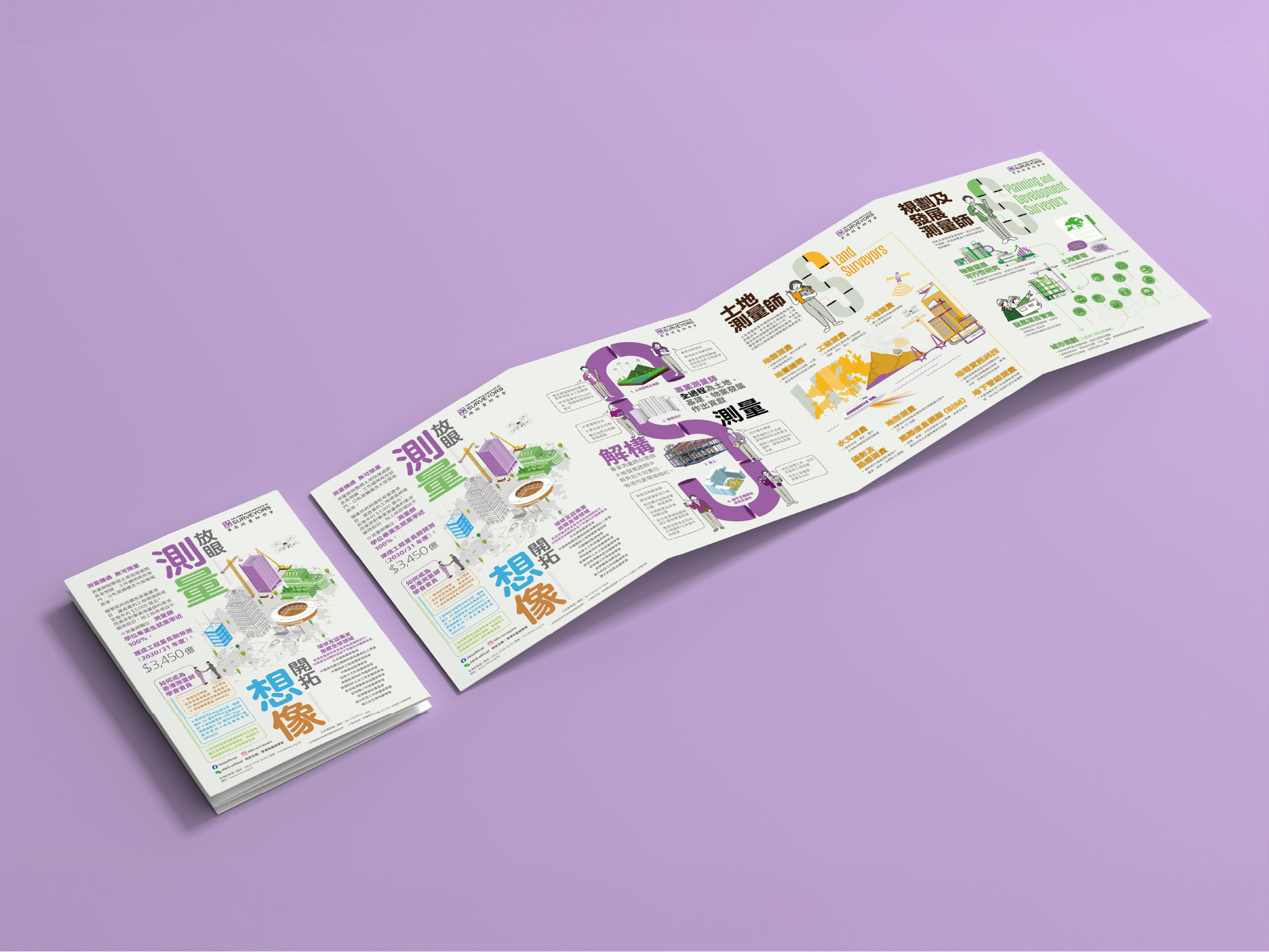 Commissioned to attract university and college students to the surveying profession, I structured the leaflet content around clear career pathways and specialization options. The design strategy drew on minimalist Japanese aesthetics for visual clarity, using clean lines, open space, and a fresh color palette to enhance approachability. Content was organized for quick scanning, with infographics and callouts to guide the reader. The leaflet supported the Institute’s outreach objectives at campus events and online channels.